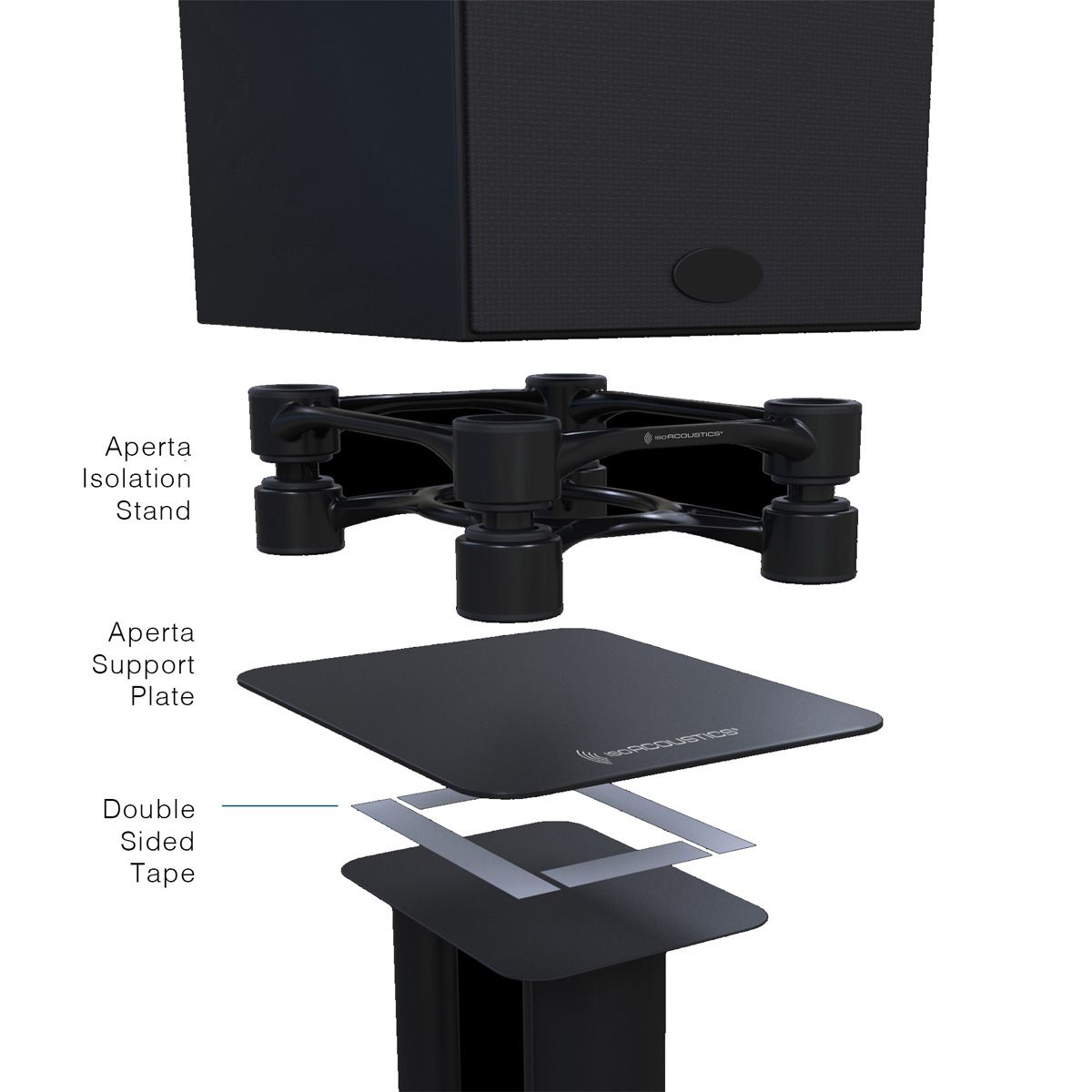 Spoločnosť IsoAcoustics vyvinula nosnú dosku pre stojany na regálové reproduktory Aperta 155 a Aperta 200, ktoré rozširujú povrch vášho súčasného podlahového stojana alebo nosnej konštrukcie tak, aby vyhovovali APERO. Na upevnenie nosnej dosky na miesto slúži obojstranná páska. S touto podpernú doskou môžete použiť brilanciu izolácie Aperta s väčšinou existujúcich stojanov na reproduktory.