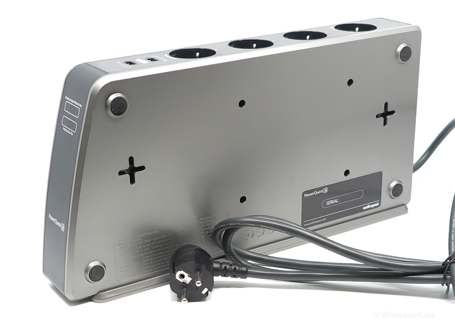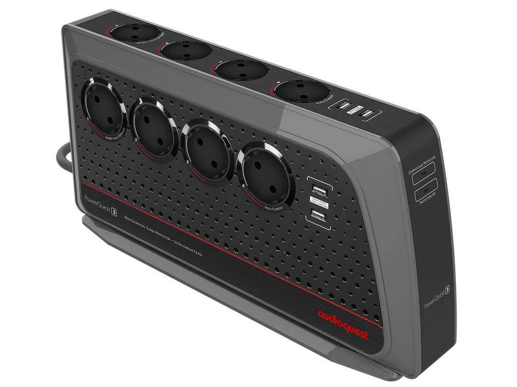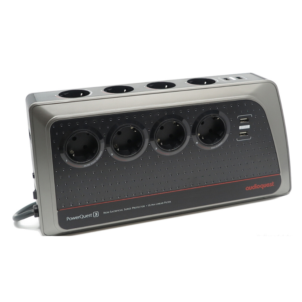 Audioquest PowerQuest 3 filtruje rušenie signálu pre audio i video prehrávača, zobrazovače aj ďalšie časti reťazca. Dve z ôsmich zásuviek nie sú filtrované a umožňujú pripojenie vysoko výkonných komponentov (zosilňovačov, subwooferov alebo aktívnych reproduktorov bez aktuálnej kompresie). Čerešničkou na torte sú sieťové vstupné a výstupné konektory RJ45 a štyri vysokorýchlostné nabíjacie porty USB, cez ktoré môžete rýchlo nabíjať váš mobilný telefón, tablet, reproduktor Bluetooth, slúchadlá a ďalšie.
